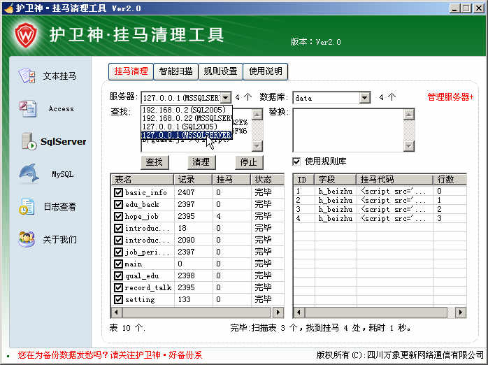 为此,护卫神特意开发了这款最强大的挂马清理工具,能够快速准确的清理:文本文件、Access数据库、SQL Server数据库、MySQL数据库的挂马。