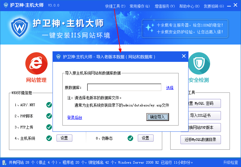 2、如果您是旧版的护卫神·主机管理系统用户,那么可以先备份配置数据库“my.asp”,然后卸载旧版的主机管理系统,再安装主机大师,导入原来的数据即可,可以参考: