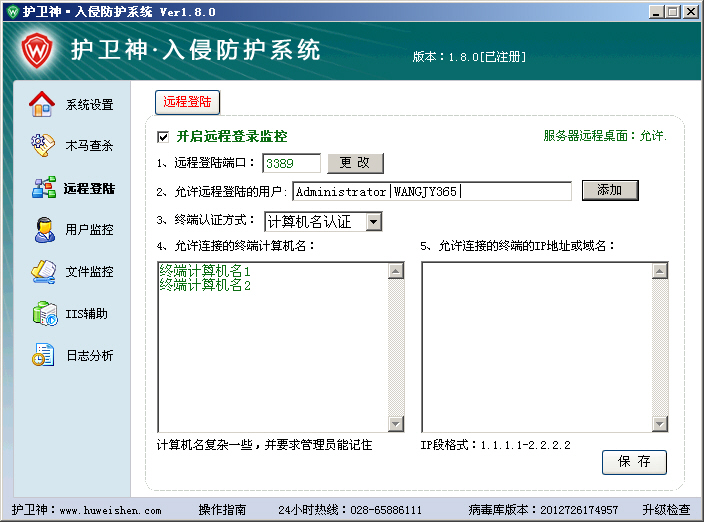(1)计算机名认证(图1):假设您拥有1台电脑A,1台服务器B,通过A对B进行远程管理,B安装有护卫神,那么,就需要将A的计算机名输入到B的护卫神允许远程的计算机名中,可以换行分隔输入多个,设置后,只有终端计算机名在该列中的,才能对B进行远程管理,其他终端计算机名的计算机将会被拦截。